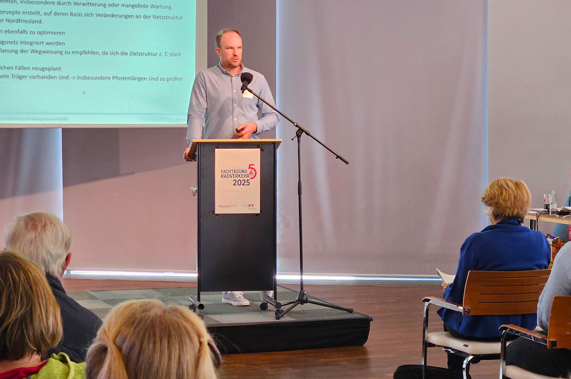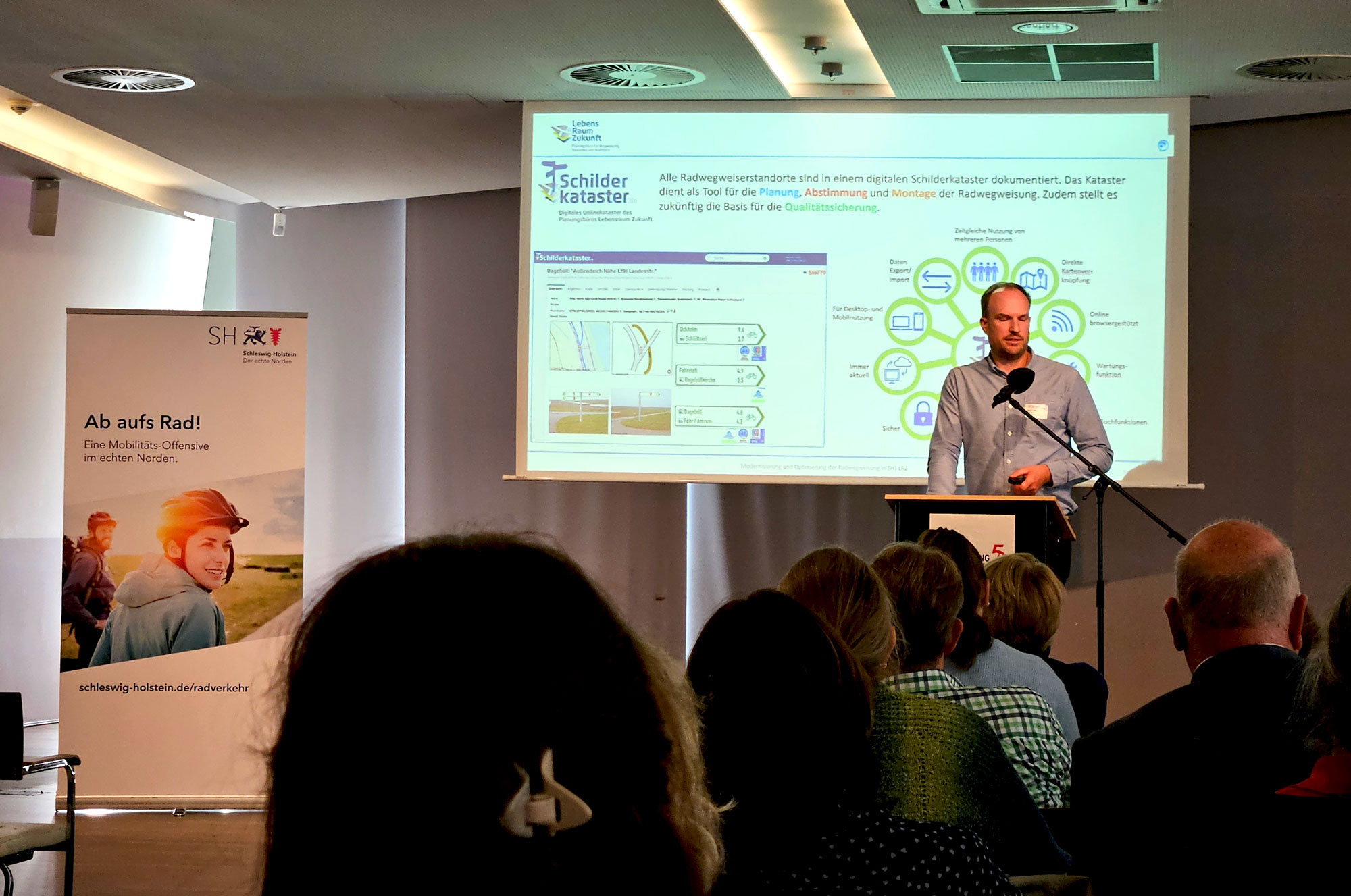 Am 09.10. fand wieder die jährliche Fachtagung Radverkehr des Landes Schleswig-Holstein in Kiel statt. Die Tagung ist immer eine gute Gelegenheit, alle zu Versammeln, die sich mit dem Thema Radverkehr in Schleswig-Holstein beschäftigen. Vielfältige Vorträge zeichnen dabei ein tolles Bild, wie sich der Radverkehr in Schleswig-Holstein immer weiter verbessert. In diesem Jahr waren auch wir mit einem Vortrag dabei. Niels-Christian Rohde stellte die „Modernisierung und Optimierung der Radwegweisung in Schleswig-Holstein“ in einem kurzweiligen Vortrag dar. Die Teilnehmenden aus Politik und kommunaler Verwaltung bekamen einen guten Eindruck, welche Chancen das neue Maß der Radwegweisung den Kommunen bietet.